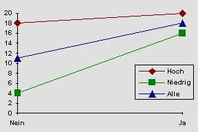 Verständnisfrage: Wie sähe der Graph aus, wenn Schichtzugehörigkeit keinen Einfluß auf den Effekt des Programms hätte? Antwort: Linie für hohe und niedrige Schicht wären gleich.