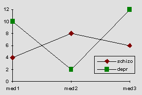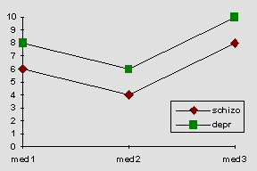 1 schizo med1 8 2 schizo med1 4 3 schizo med1 0 4 depr med1 14 5 depr med1 10 6 depr med1 6 7 schizo med2 10 8 schizo med2 8 9 schizo med2 6 10 depr med2 4 11 depr med2 2 12 depr med2 0 13 schizo med3 8 14 schizo med3 6 15 schizo med3 4 16 depr med3 15 17 depr med3 12 18 depr med3 9