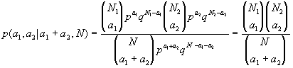 ; analog läßt sich die Wahrscheinlichkeit für die zweite Stichprobe berechnen. Da man die beiden Stichproben als unabhängig betrachten kann, errechnet sich die gemeinsame Wahrscheinlichkeit dafür, daß a1 und a2 Werte über dem Median erhalten werden, aus dem Produkt der Einzelwahrscheinlichkeiten. In diesem Fall interessiert allerdings die bedingte Wahrscheinlichkeit dafür, daß a1 + a2 Werte über dem Median bei N1 + N2 Beobachtungen erhalten werden; sie läßt sich folgendermaßen errechnen: