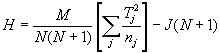 Die parameterfreie Varianzanalyse nach Kruskal-Wallis ist eine Erweiterung des U-Tests von Mann-Whitney. Auch hier werden die Scores aller J unabhängigen Gruppen gepoolt, nach der Größe sortiert und Rangplätzen zugewiesen; die Ränge beziehen sich also auf die Gesamtstichprobe. Dann wird die Rangsumme für jede einzelne Gruppe gebildet (Tj = Rangsumme für Gruppe j). Da es sich um unterschiedliche Gruppengrößen handeln kann, müssen diese Summen noch an der Gruppengröße relativiert werden. Für die Prüfgröße H gilt folgende Formel:
